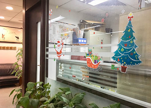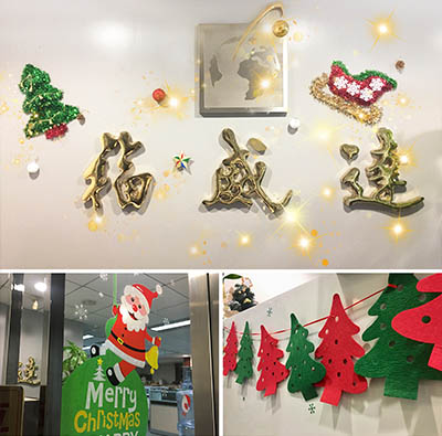 充满圣诞气氛的装饰点缀自然是必不可少的。为了提早给大家感受节日气氛和焕然一新的感觉,企划部的同事们特意在提前一天晚上下班后精心布置。